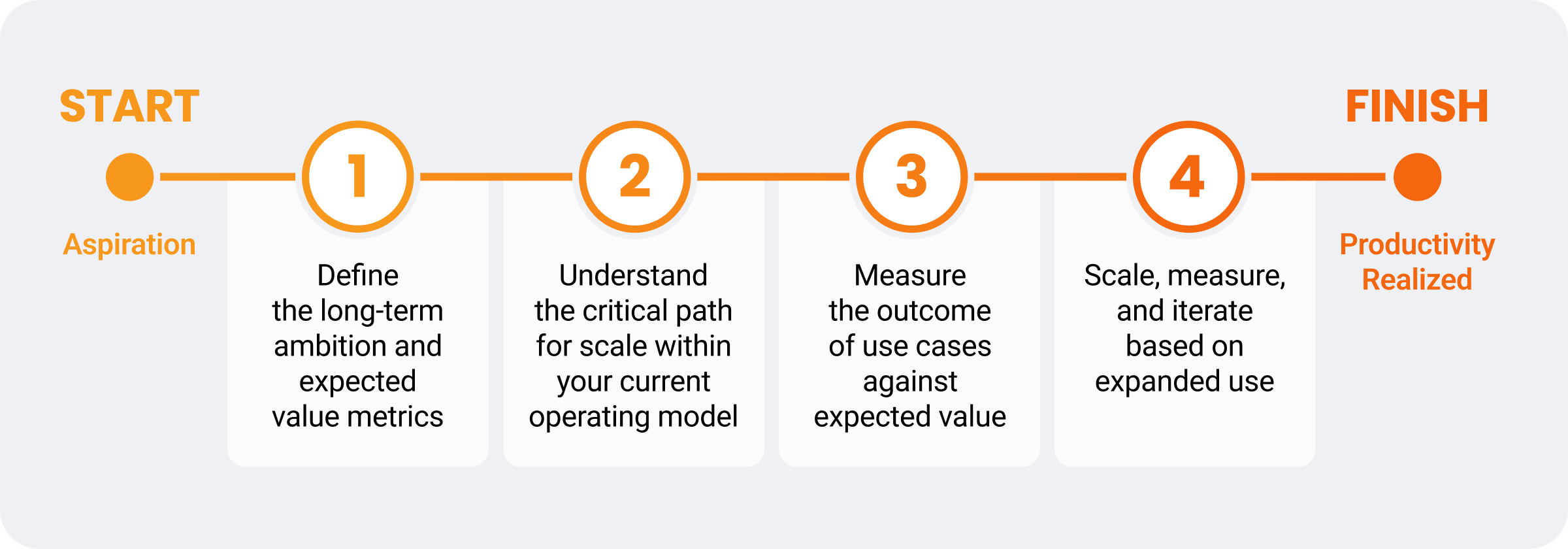 • Periodically evaluate ROI from AI so teams continuously measure and adjust without process and adoption barriers, especially as the technology improves. Successful change with AI requires optimizing with humans in the loop.<