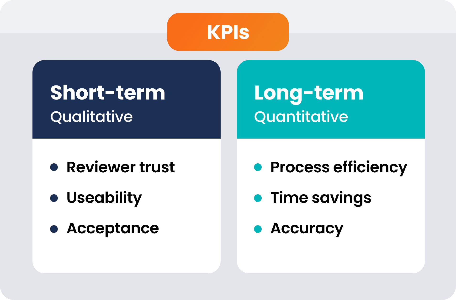 Even at this early stage of AI adoption in MLR, there are reliable KPIs to use as guides. For example, measure short-term qualitative factors such as reviewer trust and longer-term quantitative results including time savings.