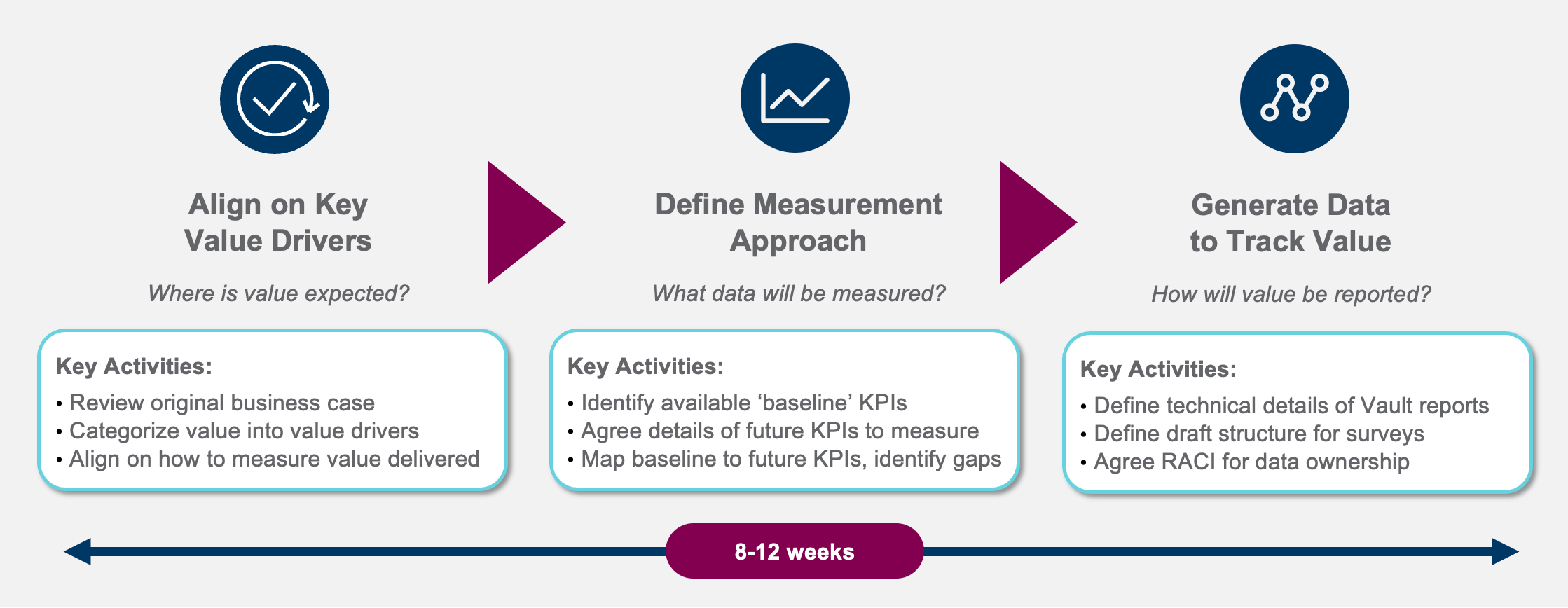 For instance, if an intended benefit of implementation is to undertake parallel submission reviews and approvals, your value driver is reduced cycle time. A relevant KPI could then be the average time that a document sits in review or approval. Alternatively, your value driver might be improved quality (e.g., so that your business has better access to approved documents to build submissions), in which case the data required could be the percentage of submissions approved without health authority questions.