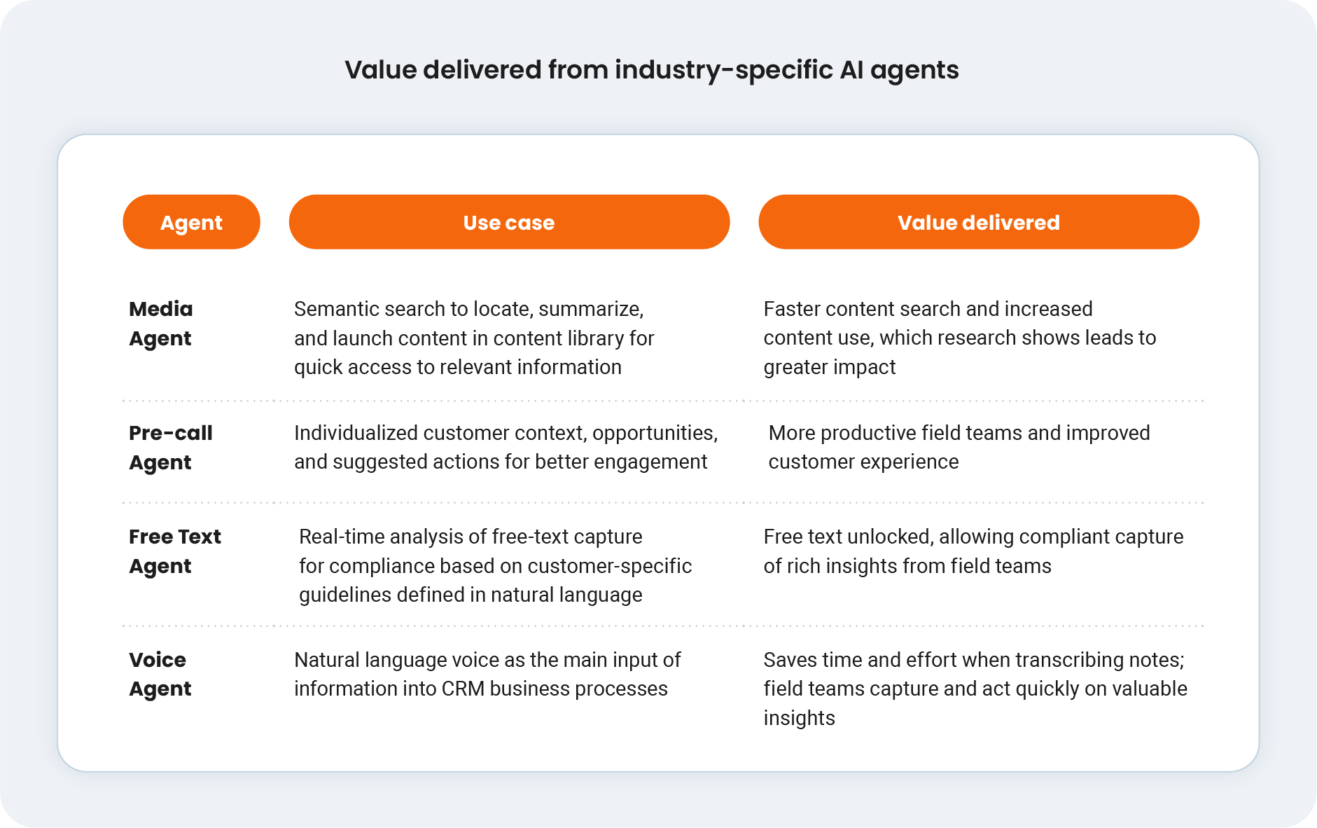Commercial models in life sciences are changing and this will continue to accelerate over the next 10 years. Companies that embrace AI-driven engagement and decision-making will gain a clear competitive advantage. To stay ahead, your AI capabilities must evolve in step with the industry. Through industry-specific enhancements, such as specialized features for biopharma workflows or advanced analytics for medical affairs, AI built for life sciences can support your progress.