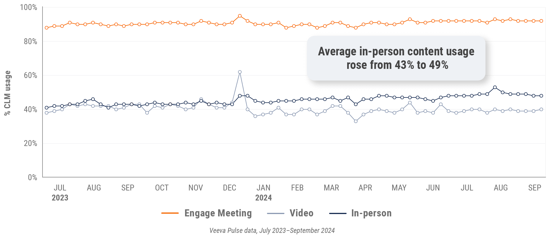 - In-person % CLM usage: Percentage of in-person engagements that leveraged content in Veeva CRM