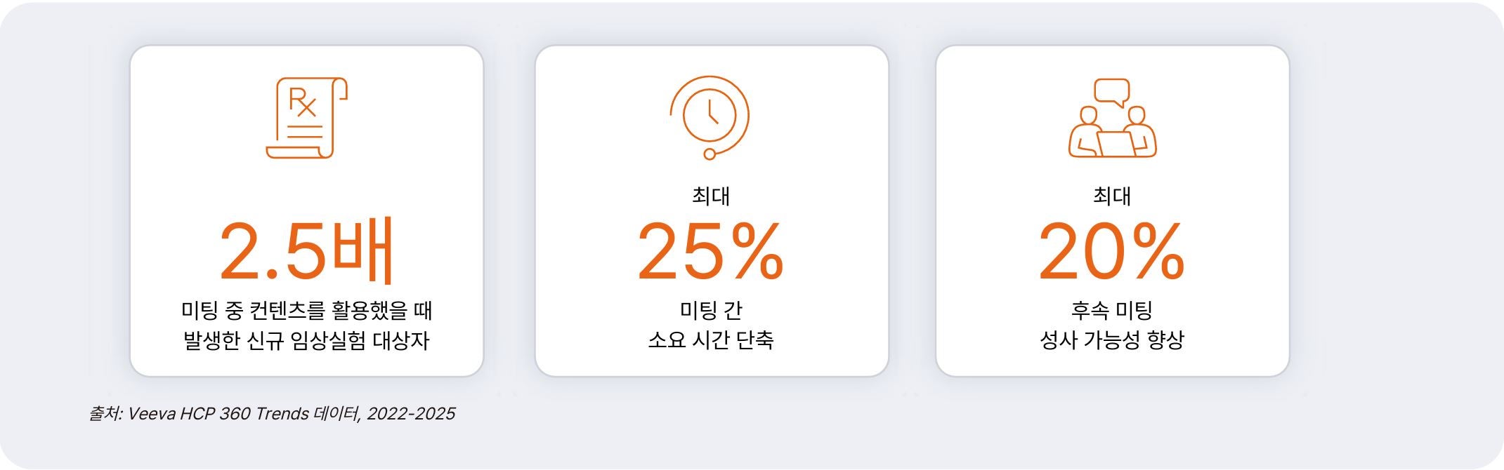 Veeva HCP 360 Trends Report는 업계에 유용한 인사이트를 제공하고, 필드 팀의 상업적 성공 개선을 위해 전략을 주요 시장 동향에 맞게 조정하도록 돕습니다. 글로벌 Veeva Business Consulting 팀은 또한 Veeva HCP 360 데이터를 활용한 업계 벤치마킹을 통해 고객이 전략을 수립하는 데도 도움을 줍니다.