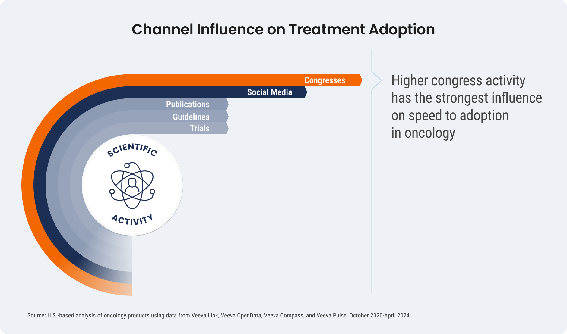 • Congress activity has the strongest influence on clinical decisions: Higher investment in pre-launch congress activities has the most influence on treatment after approval. Congresses, and the digital discussions that follow, help increase scientific awareness and drive impactful medical conversations more than investment in clinical guidelines and publications.