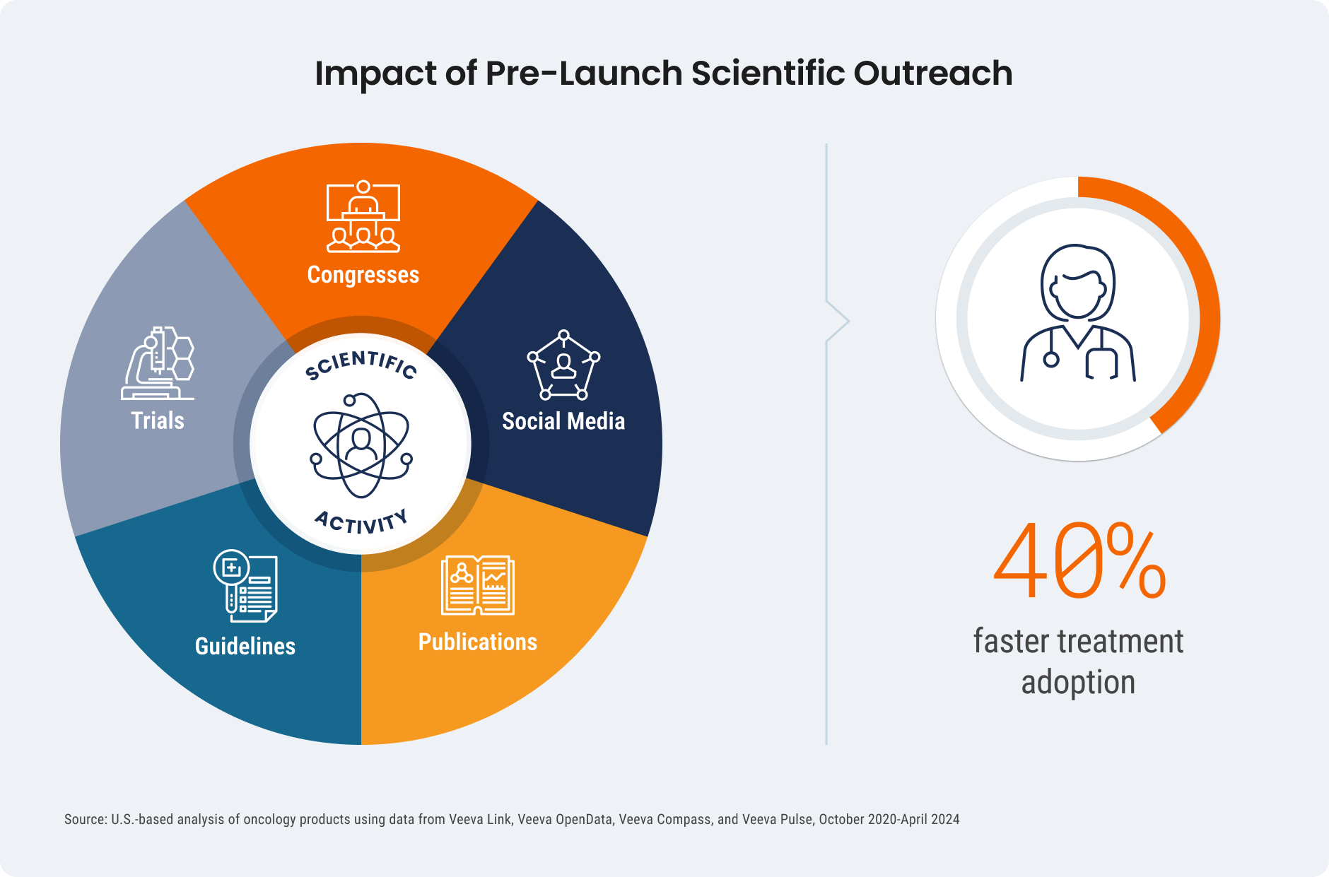 • Targeted pre-launch scientific activities speed treatment adoption: By engaging key experts at congresses, helping develop clinical guidelines, and securing coverage in publications before launch, companies see 40% faster treatment adoption than those that invest less in this outreach. This demonstrates that more resources for medical teams during this stage can boost launch success.