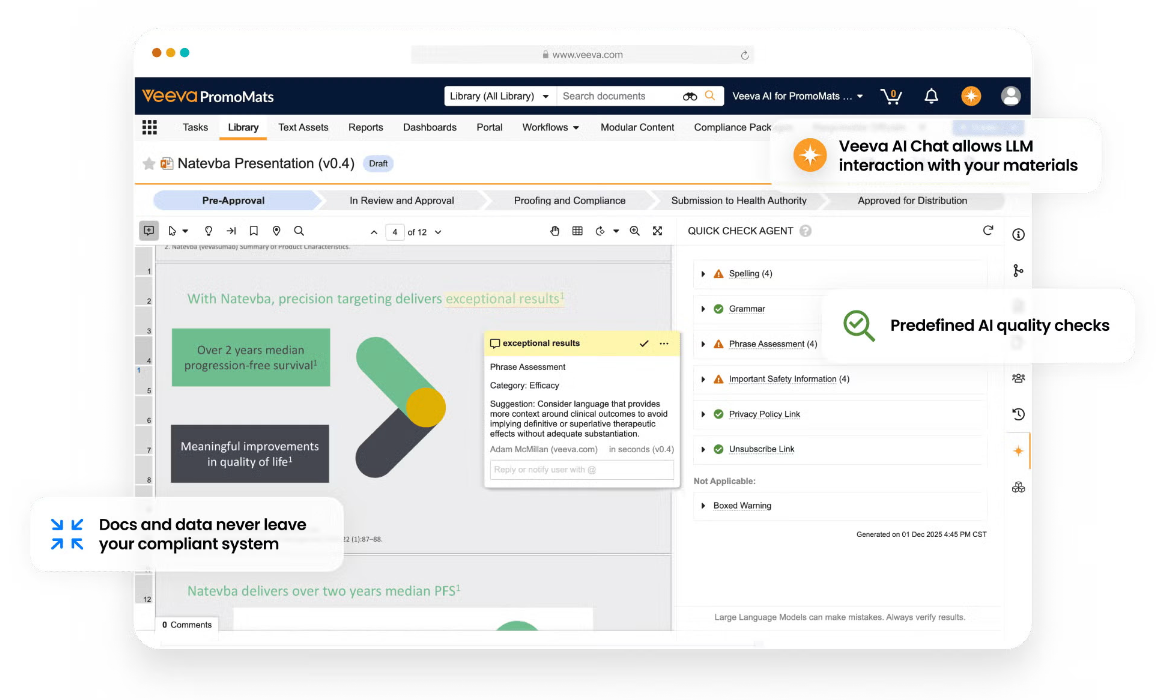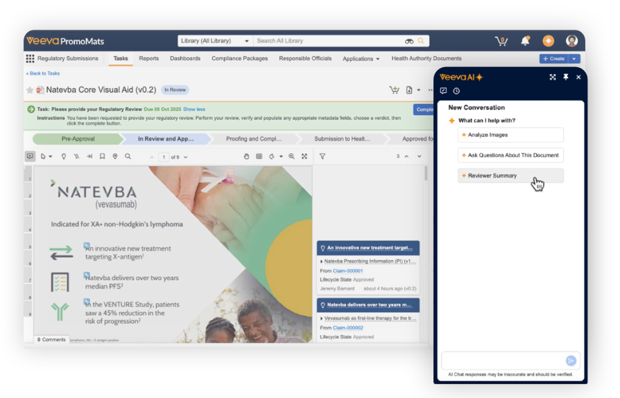 Veeva AI for PromoMats introduces automated quality checks and context-aware insights that simplify collaboration, reduce manual effort, and support more efficient and consistent MLR review. With your content and data staying securely inside Vault, teams gain a seamless and compliant AI experience that scales with the organization and supports ongoing advancement in how content is created, evaluated, and approved.