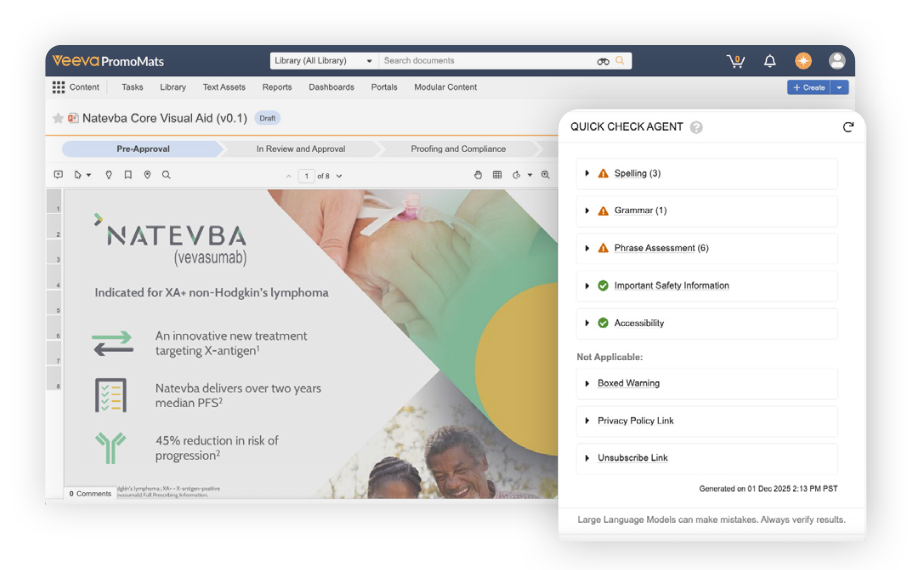AI-powered checks catch issues before MLR review, which reduces rework and review cycles. The automation of repetitive and time-consuming validation tasks supports faster and more consistent approvals while maintaining compliance standards.